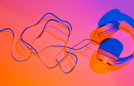Headphones on vivid colorful (multicolor tonal transitions) background. Pop art style, music theme poster with free copy (text) space.