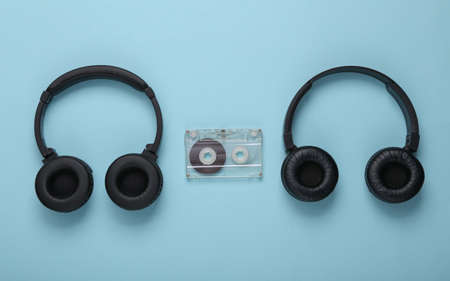 Two pairs of black stereo headphones and audio cassette on a blue background