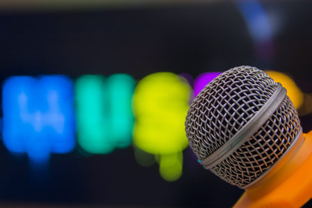Close up of microphone on stage with blurred background and copyspace