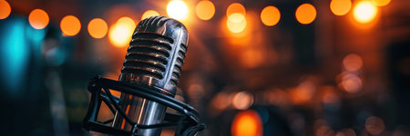 Close-up of black microphone on stand with blurred warm-lit background. Perfect for podcasts, music performances, broadcasting or public speaking in a professional studio setting with copy space.