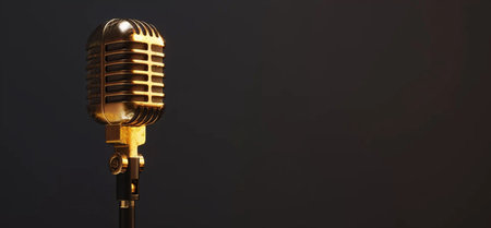 A vintage golden microphone, perfect for studio recording, broadcasting, or performance. Classic retro design on a dark backdrop.