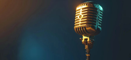 A classic gold microphone on a stand, illuminated by a dramatic spotlight, ideal for music recording and voiceovers.