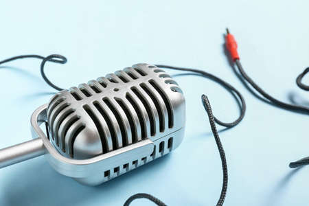Retro microphone on color background, closeup