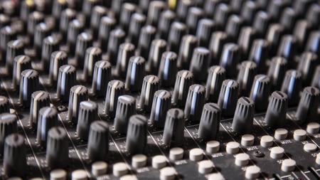 Professional audio mixer console with black knobs to equalize sounds. Audio recording studio tool. Music and entertainment concept