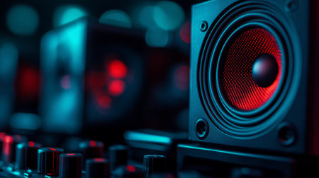 A Close up of high end audio speakers with vibrant red accents, showcasing intricate details and modern design. Perfect for music enthusiasts and audiophiles
