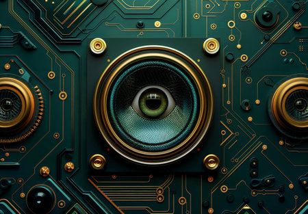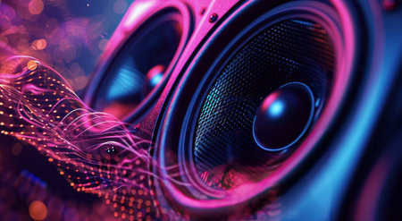 Captivating close-up of a speaker driver showcasing vibrant colors and intricate details, perfect for themes of music, technology, and audio equipment.