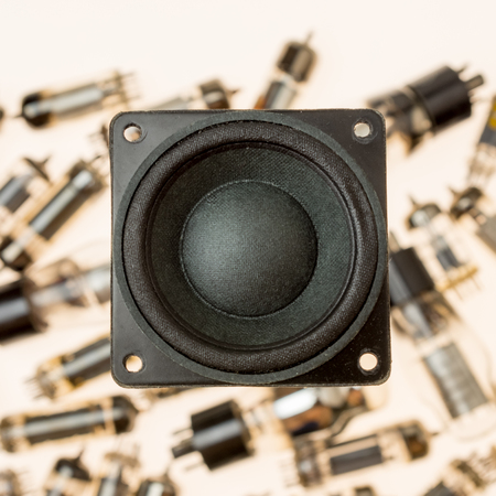 Vacuum electronic tubes and uncabled loudspeaker on white background