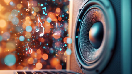 Discover the vibrant energy of sound with this captivating image of a speaker, enhanced by musical notes and colorful bokeh lights, evoking creativity and joy.