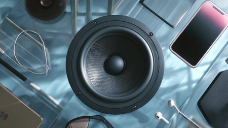 Top view of a modern loudspeaker on a glass table, with a smartphone and other tech gadgets