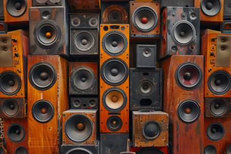 A captivating shot of speakers arranged in a row at a live concert, illuminated by colorful stage lights, capturing the energy and excitement of a performance