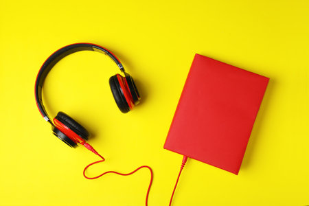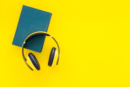 Audiobooks concept. Headphones near hardback book with empty cover on yellow background top view.