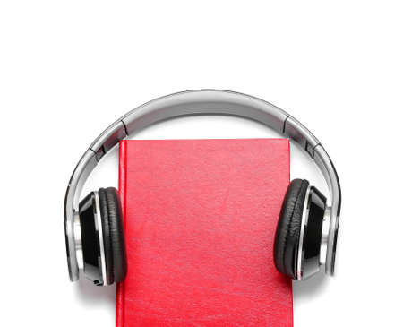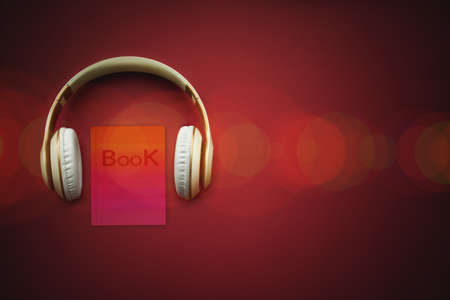 Close-up earphones and Audiobook on red background with bokeh. Audio, listen. Audiobook concept
