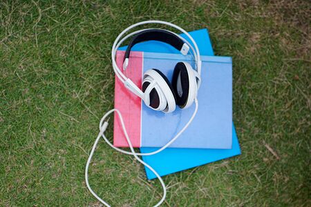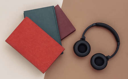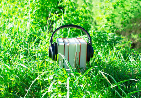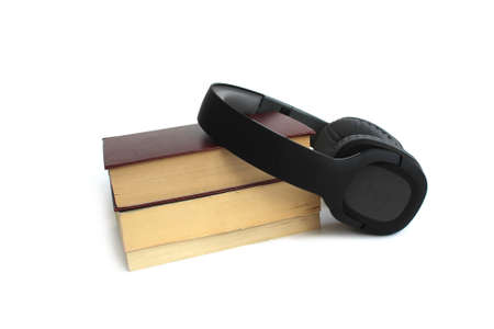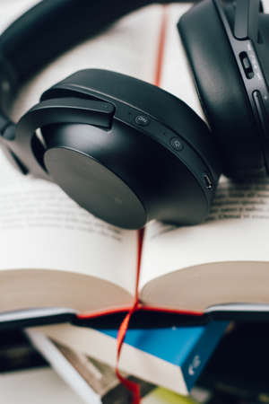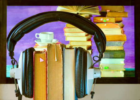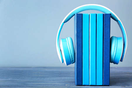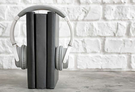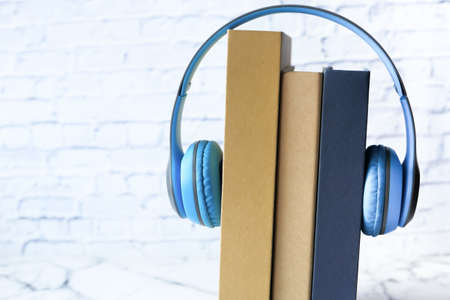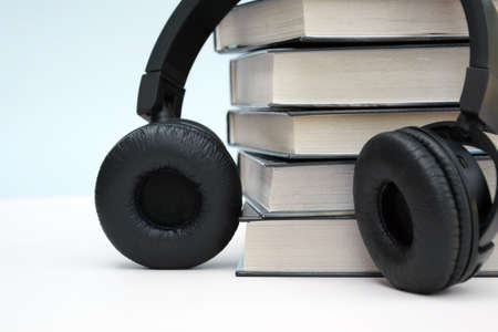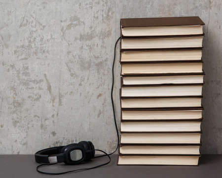 stack of books .headphones. Concept Audiobook concept, listen to audiobooks