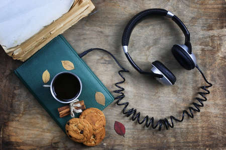 Close-up of white headphones with mobile and book on wooden table. on background blurred coffee drink and blue diary
