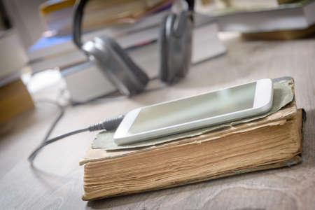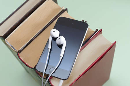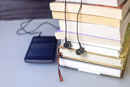 Smart phone with headphones and the paper books. Concept of listening to audiobooks.