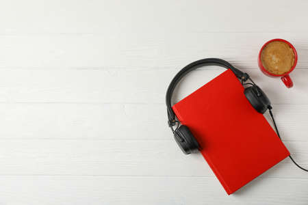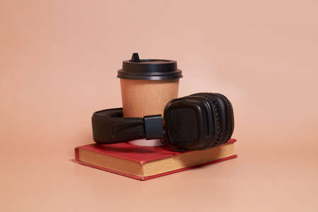 Audiobook. A paper cup of coffee and headphones lie on a book