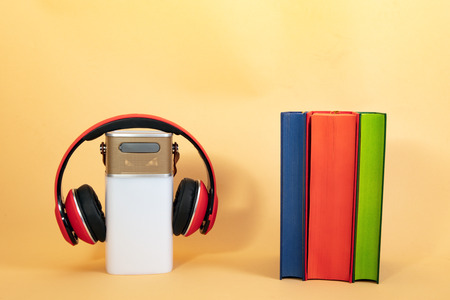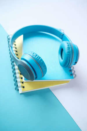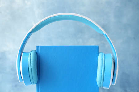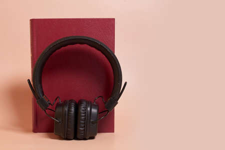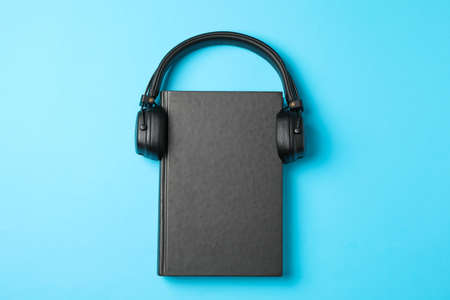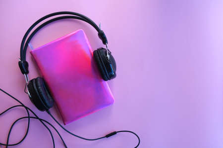audiobook. Headphones stand next to a book on a colored background. copy space