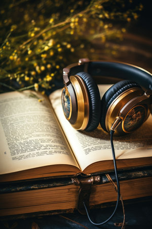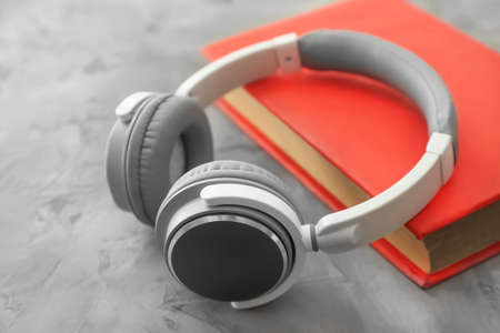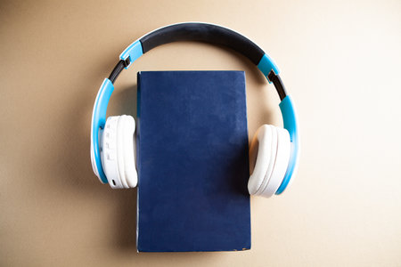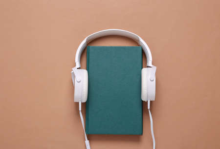 audio book concept with book and vintage headphones,literature,entertainment,education,copy space on the book cover