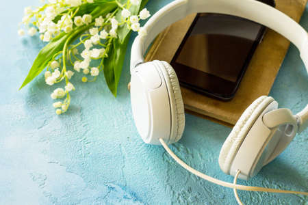 Springtime. Smartphone, lilies of the valley and headphones on stone table. Copy space.