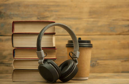 Audio book concept. Black headphones with books and cup of black fresh coffee on wooden table. Top view