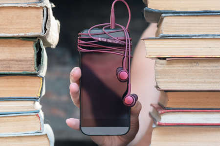 Mobile phone with blank screen with copy space and old books. Electronic book concept.