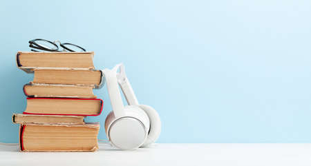 Old books, headphones and eyeglasses on wooden table and copy space. Audiobooks and education template