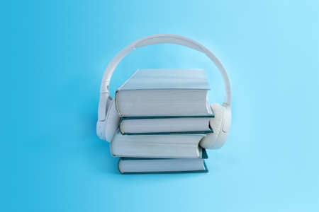 Wireless white headphones on stack of books on light blue background. Concept for audiobooks in minimal style.