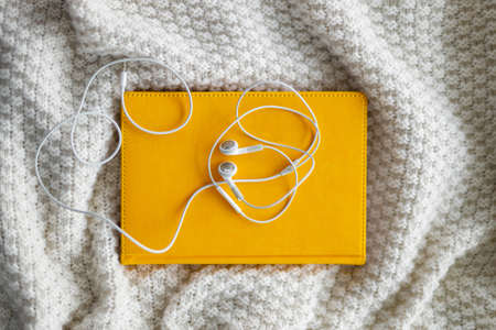 white headphones lie on a yellow notepad. Gray knitted background. Home study. Distance education