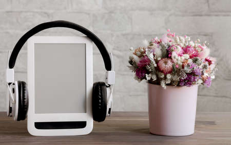 A white audiobook, headphones, a bouquet of dried flowers against a brick wall. Close-up, brown wood surface. The concept of audiobooks.