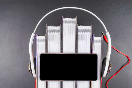 Audio listen book. Phone screen with audiobook app on paper books black background. Online education course, E learning class and e book digital technology concept