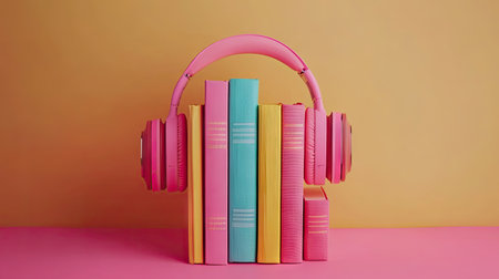 A stack of colorful books with a set of wireless headphones leaning against them, symbolizing the fusion of traditional literature and modern audio experiences.