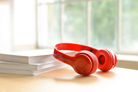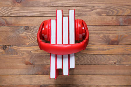 the concept of using audio books put on the headphones on the book on the background of wooden wall