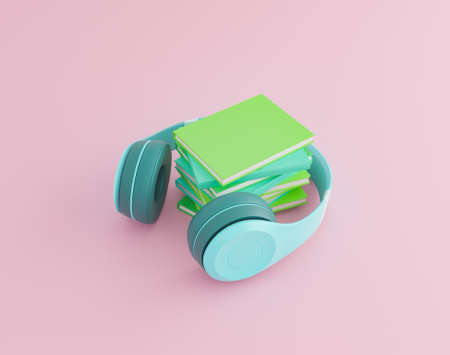 audio book concept. headphones and books on minimalist background with pastel colors. 3d render