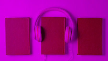 Minimalism online listen to books concept. Audiobook Book with headphones in pink neon light