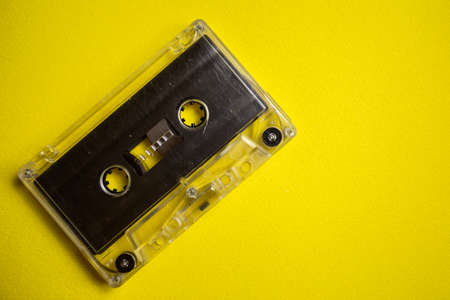 Retro cassette tape on the yellow background. copy space