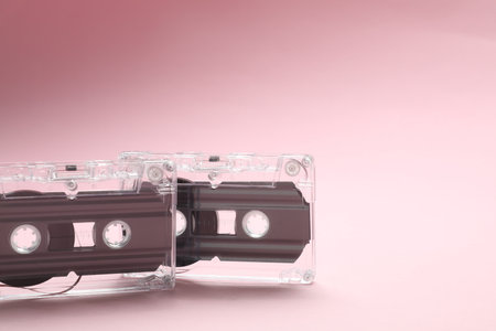 Audio cassettes with magnetic tapes on pink background, closeup. Space for text
