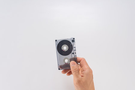 Male hand holding old analogue audio cassette on gray background. Audio cassette held in hand, flat background, ample copy space. Great for retro design themes