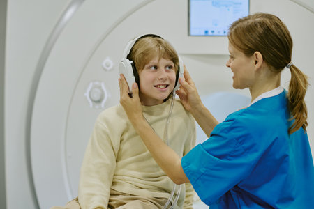 Caucasian boy sitting in front of MRI scanner wearing headphones while young adult Caucasian woman in medical scrubs adjusting headphones, both interacting and preparing for medical procedure