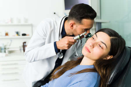 Otorhinolaryngologist doctor diagnosing hearing problems of young woman using otoscope