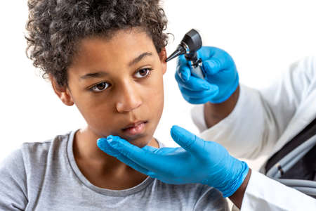 ENT physician looking into patients ear with an otoscope , Child suffereing from ear pain at hospital