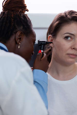 Ear deseases, otitis, hearing loss, otolaryngology concept. Caucasian professional ent doctor inspecting the ear canal and eardrum of young African woman patient with otoscope