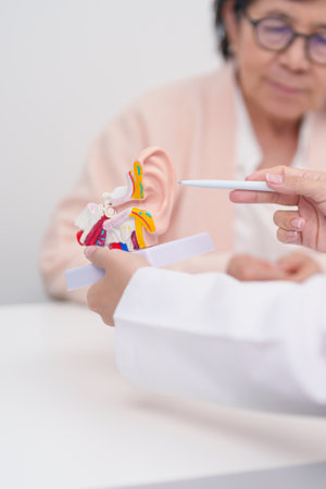 Elderly Patient consulting Doctor to Ear disease. Senior Health Medical Diagnosis. Anatomy Ear model for Atresia, Otitis Media, Pertorated Eardrum, Meniere syndrome, otolaryngologist, Hearing Loss