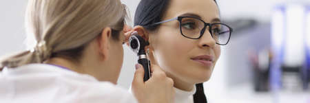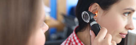 Advanced examination of a woman's ear using an otoscope at a doctor's appointment. Otoscopy. Visit to the ENT doctor and consultation