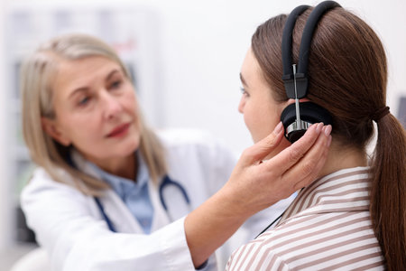 Otorhinolaryngologist examines patient ear with an otoscope