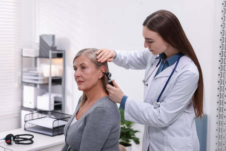 Otorhinolaryngologist doctor examining patients ear with otoscope in clinic