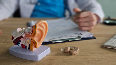 Model of human ear set on desk in clinic with hearing aid and healthcare professional present