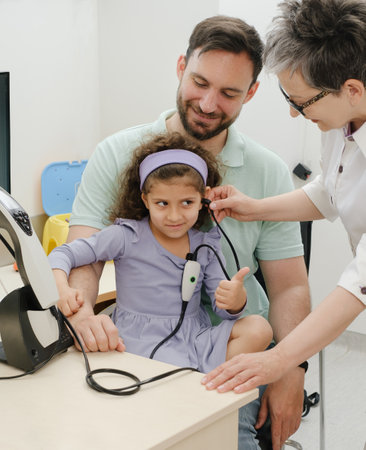 Child hearing test. Doctor audiologist examineing kids ear and assess disorder of hearing using screening, diagnostic technology