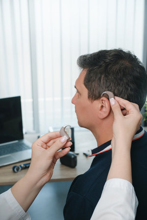 Doctor Inserting Hearing Aid In The Ear Of Man