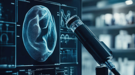 A high-tech microphone and digital ear visualization illustrate medical research in audiology, emphasizing the intersection of technology, health, and sound analysis.