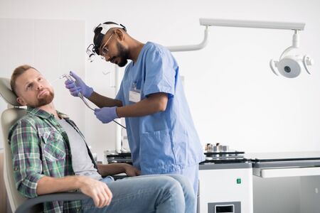 African Doctor Examining Male Patient's Ear With Otoscope